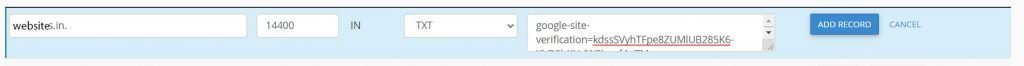 Once you enter the editor you need to add a TXT record with the value of what you copied in the google verification screen.